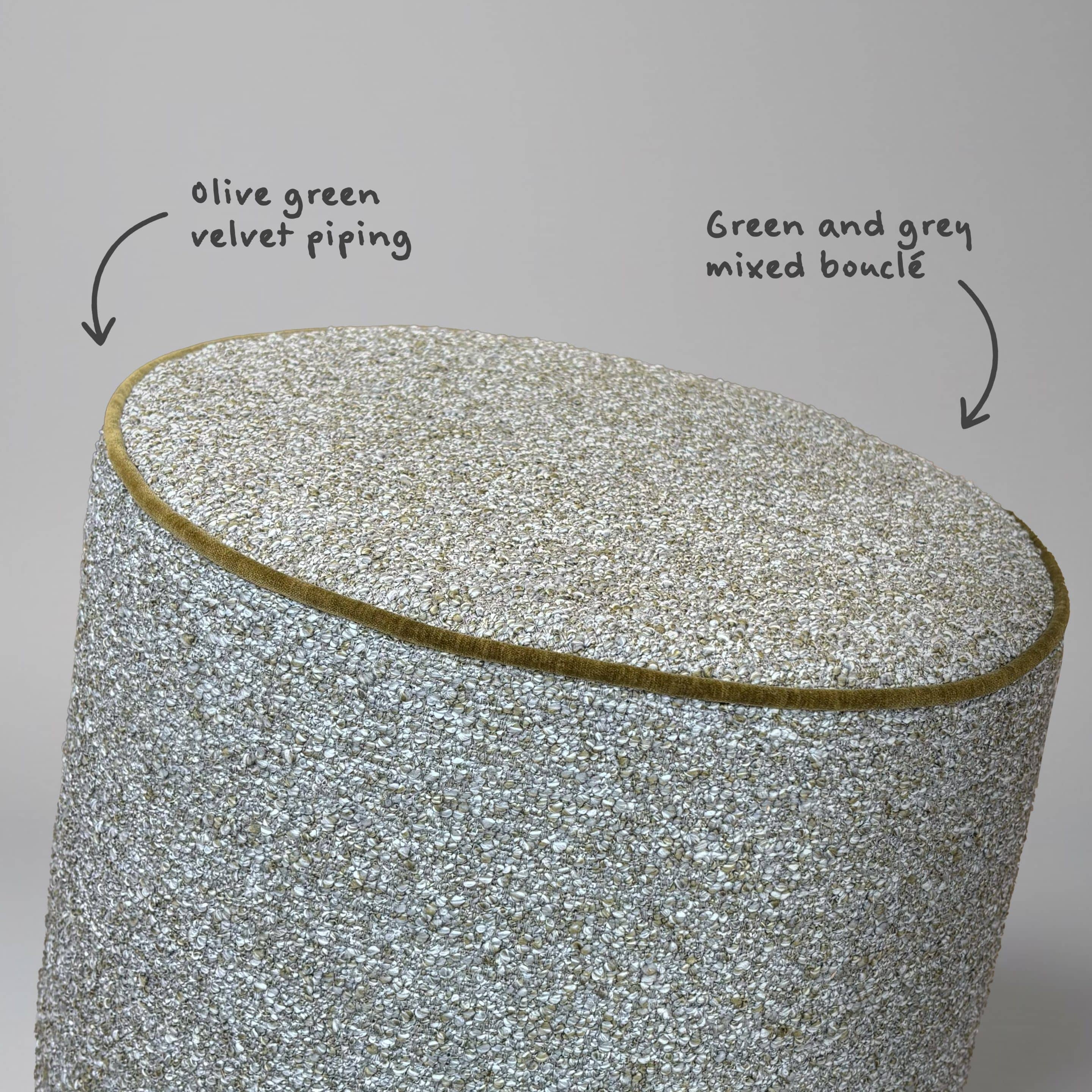 I may be small, but I pack a punch when it comes to style and usefulness. Built from strong, comfy block foam with a sturdy wooden base, I’m light on my feet and easy to scoot around. Upholstered in green and grey bouclé, I bring a touch of elegance and modern texture to any room. Pop your toes on me, perch for a chinwag, or plonk me wherever you fancy – I’m up for anything.