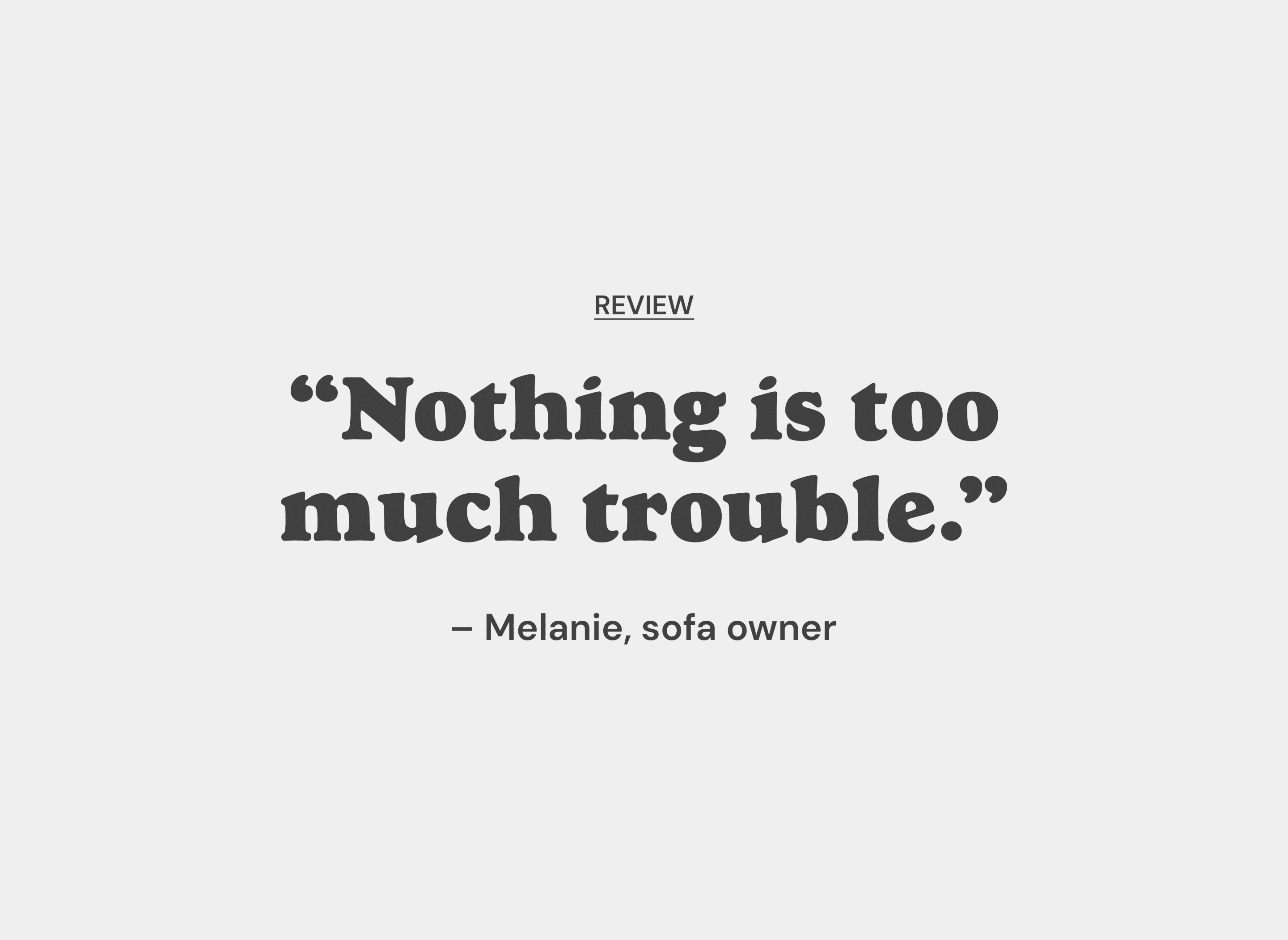 Because our sofas are made to order just for you (think of it as a sofa tailored to your tush), we can’t offer returns or refunds. But if there’s a manufacturing fault, don’t worry, we’ll sort it. We’ll fix it up and get it back to you quicker than you can say “pass the biscuits.”